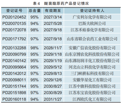 巴斯夫欧洲公司于2002年12月13日在我国首先临时登记了醚菌酯原药(总有效成分含量为94%),后去临转正,2008-2017年原药产品登记多次进行回调,其间产品登记1~3个不等,2018年后无原药登记。原药产品中,98%含量2个,97%含量3个,95%含量6个,94%含量2个;按毒性等级划分为低毒9个,微毒4个;境外企业1家,境内企业12家(其中江苏、山东企业各3家,安徽2家,四川、江西、河北、河南各1家)。醚菌酯原药产品登记情况见表4。