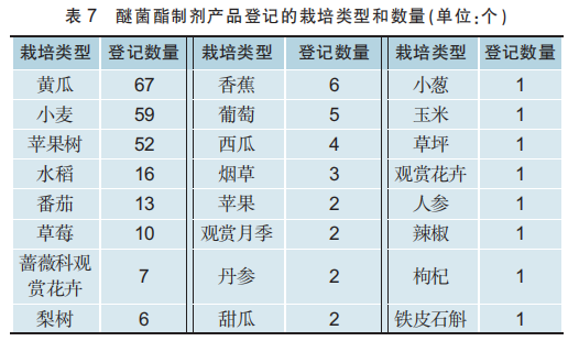 从作物来看,醚菌酯产品登记在24种栽培类型上,在黄瓜上的登记数量是67个,具有绝对领先地位,登记数量排在其后的是小麦59个、苹果树52个,排在后面的是水稻16个、番茄13个、草莓10个,随后蔷薇科观赏花卉、梨树、香蕉、葡萄、西瓜、烟草的登记数量均超过了2个。其中有的醚菌酯生产企业在小麦、烟草、番茄、葡萄上进行了登记,也有的醚菌酯生产企业在梨树、苹果树、铁皮石斛上进行了登记;有的醚菌·啶酰菌生产企业在甜瓜、苹果、草莓、葡萄、观赏月季、黄瓜上进行了登记,有的苯甲·醚菌酯生产企业在蔷薇科观赏花卉、香蕉上进行了登记,等等。醚菌酯制剂产品登记的栽培类型和数量见表7。