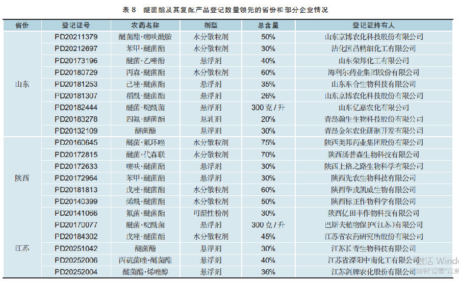 从生产企业来看,醚菌酯制剂产品生产企业共107家,分布在我国18个省(自治区、直辖市)106家,其中山东省的企业数量35家,排名第一,占比为33.02%;陕西省的企业数量13家,排名第二,占比为12.26%;江苏省的企业数量11家,排名第三,占比为10.38%,安徽省(8家)、江西(7家)、河南省(5家)等地区企业家数均超过了4家。除中国企业外,还有1家德国企业(巴斯夫欧洲公司)也在中国进行了醚菌酯制剂产品登记。醚菌酯及其复配产品登记数量领先的省份和部分企业情况见表8。