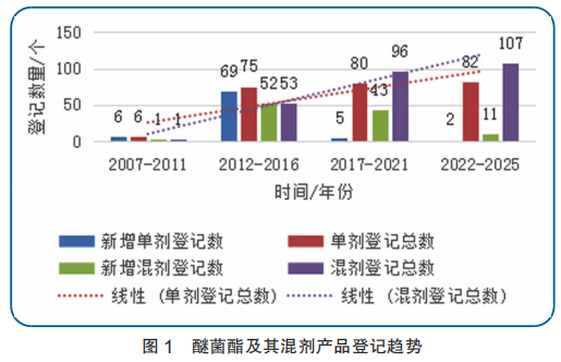从制剂产品登记趋势来看,相比单剂产品登记,醚菌酯混剂产品登记呈快速增长态势(见图1)。2014-2025年(截至2025年12月19日),醚菌酯的单剂、混剂产品登记数量分别由31个增长至82个、20个增长至107个,分别增长1.64倍、4.35倍,年复合增长率分别为8.44%、14.99%,尤其是2014-2017年醚菌酯及其混剂登记产品数量分别为47个、65个,分别占单剂、混剂总数的57.32%、60.75%,年均登记数量分别为11个、16个。醚菌酯及其混剂产品登记趋势情况见图1。