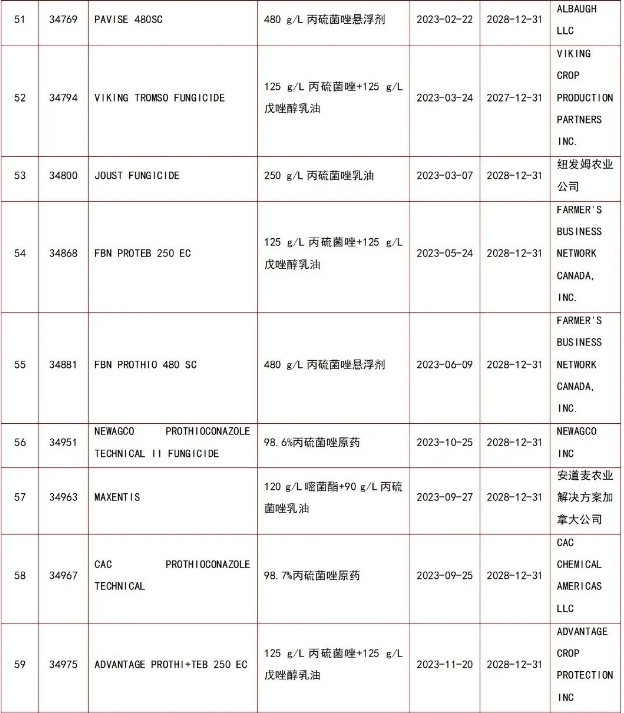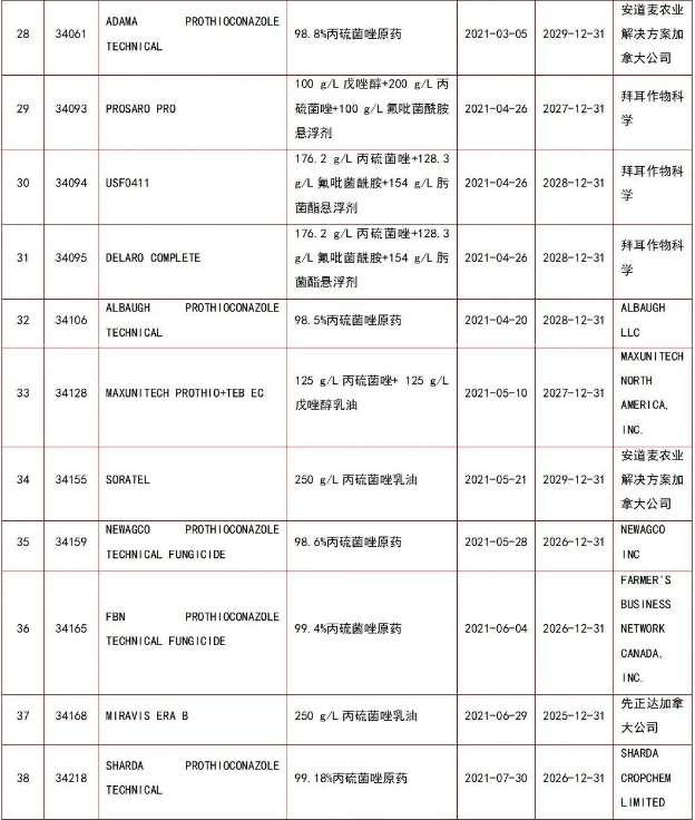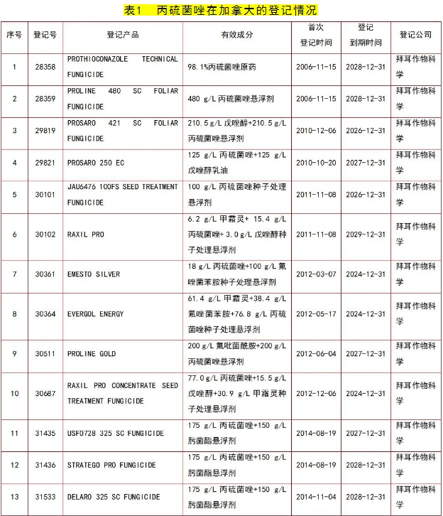 丙硫菌唑产品在加拿大先后登记的公司包括:拜耳作物科学、巴斯夫加拿大公司、WINFIELD UNITED CANADA ULC、ACETO LIFE SCIENCES, L.L.C.、泸州东方农化有限公司、安道麦农业解决方案加拿大公司、ALBAUGH LLC、MAXUNITECH NORTH AMERICA, INC.、NEWAGCO INC、FARMER'S BUSINESS NETWORK CANADA, INC.、先正达加拿大公司、SHARDA CROPCHEM LIMITED、山东海利尔化工有限公司、纽发姆农业公司、科迪华农业科技加拿大公司、VIKING CROP PRODUCTION PARTNERS INC.、CAC CHEMICAL AMERICAS LLC、ADVANTAGE CROP PROTECTION INC、宁夏新安科技有限公司等。其中,拜耳作物科学登记的丙硫菌唑产品最多,达29个;有3家中国本土公司在加拿大登记了丙硫菌唑原药。