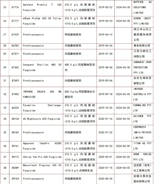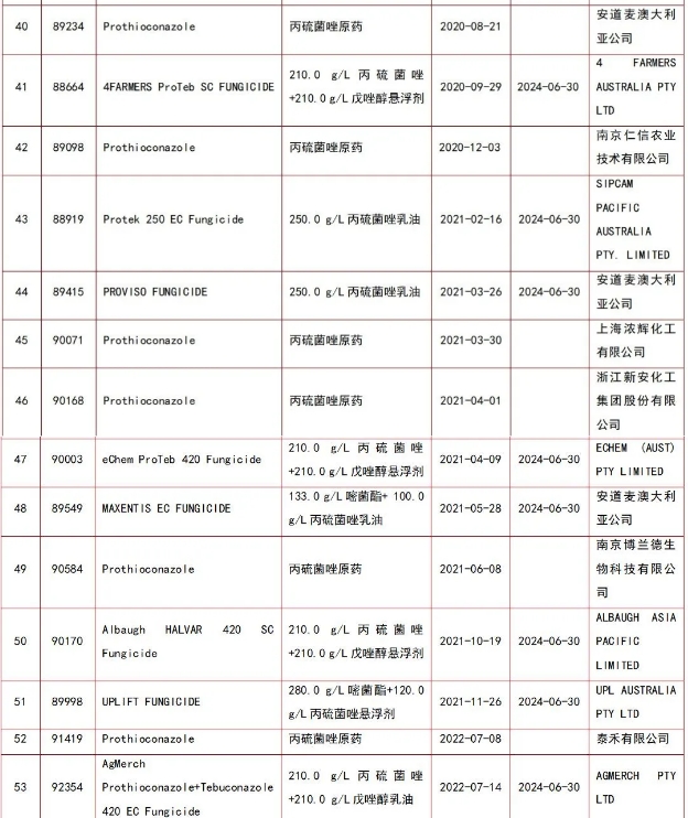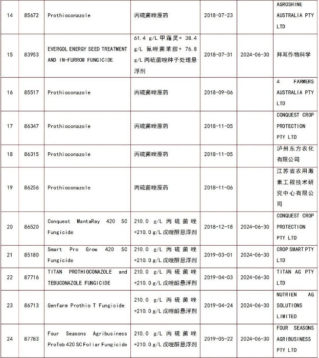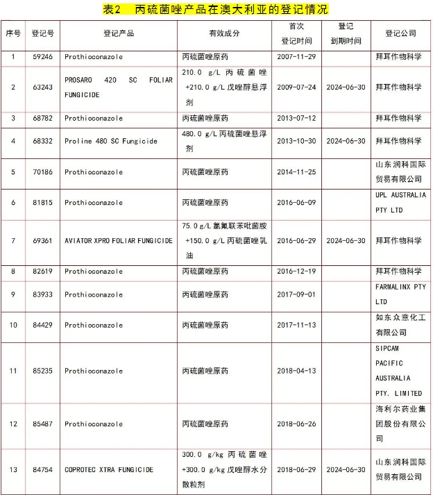丙硫菌唑产品在澳大利亚先后登记的公司包括:拜耳作物科学、山东润科国际贸易有限公司、UPL AUSTRALIA PTY LTD、FARMALINX PTY LTD、如东众意化工有限公司、SIPCAM PACIFIC AUSTRALIA PTY. LIMITED、海利尔药业集团股份有限公司、AGROSHINE AUSTRALIA PTY LTD、4 FARMERS AUSTRALIA PTY LTD、CONQUEST CROP PROTECTION PTY LTD、泸州东方农化有限公司、江苏省农用激素工程技术研究中心有限公司、CROP SMART PTY LTD、TITAN AG PTY LTD、NUTRIEN AG SOLUTIONS LIMITED、FOUR SEASONS AGRIBUSINESS PTY LTD、ECHEM (AUST) PTY LIMITED、浙江中山化工集团股份有限公司、泰禾有限公司、江苏云帆化工有限公司、永农生物科学有限公司、IMTRADE AUSTRALIA PTY LTD、AXICHEM PTY LTD、CROPNOSYS INDIA PRIVATE LIMITED、GROW CHOICE PTY LTD、迈克斯(如东)化工有限公司、安徽久易农业股份有限公司、安道麦澳大利亚公司、南京仁信农业技术有限公司、上海浓辉化工有限公司、浙江新安化工集团股份有限公司、南京博兰德生物科技有限公司、ALBAUGH ASIA PACIFIC LIMITED、AGMERCH PTY LTD、AGROGILL CHEMICALS PTY LTD、宁波三江益农化学有限公司、CROPSURE PTY LTD、ENSO CORPORATION (M) SDN. BHD.、江西汇和化工有限公司、OZ CROP PTY LTD、一帆生物科技集团有限公司等。