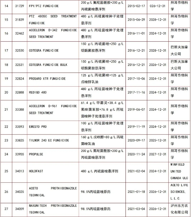 其中,拜耳作物科学的登记产品有7个;中国本土公司有18家,他们大多登记的是丙硫菌唑原药产品。