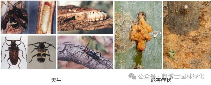 蛀干类害虫特点:a)钻蛀类害虫,如天牛、吉丁、象甲、小蠹、木蠹蛾、实蝇等,是园林植物的致命性害虫, 是导致生态性病害和树木衰退的激化因素,它们钻蛀植物的干茎和果实,造成枝、干千疮百 孔,直接导致园林植物的全株枯死和大面积死亡。b)蛀干类害虫的防治难度较大,应从种植设计开始,实现园林植物品种多样化和合理混交, 加强植物的养护,提高植物自身的防御能力。要立足于防治成虫、如人工捕杀、喜食树种引诱和集中除灭,把害虫消灭在发生危害之前。c)钻蛀类害虫化学防治的关键是喷药时间,一般在成虫羽化高峰期和卵孵化期。1)利用天牛成虫产卵前取食嫩叶和嫩枝皮层作补充营养的特点,在成虫期于树冠上喷洒 农药;在成虫羽化出穴前,在树体有虫树干喷洒农药防止成虫羽化出穴。2)成虫产卵期和幼虫刚孵化但尚未蛀入木质部前,检查枝上有无产卵刻槽和排粪孔, 如发现即用小刀挖出其卵和幼虫并处死。用注射器将药液注入孔内,并塞紧孔口;在成虫初 期,于枝、干伤疤边缘涂毒泥浆或涂白剂,能防止透翅蛾等产卵。