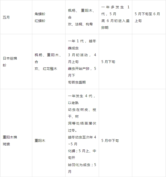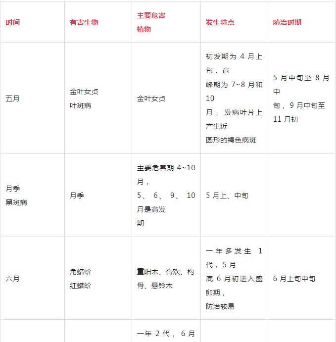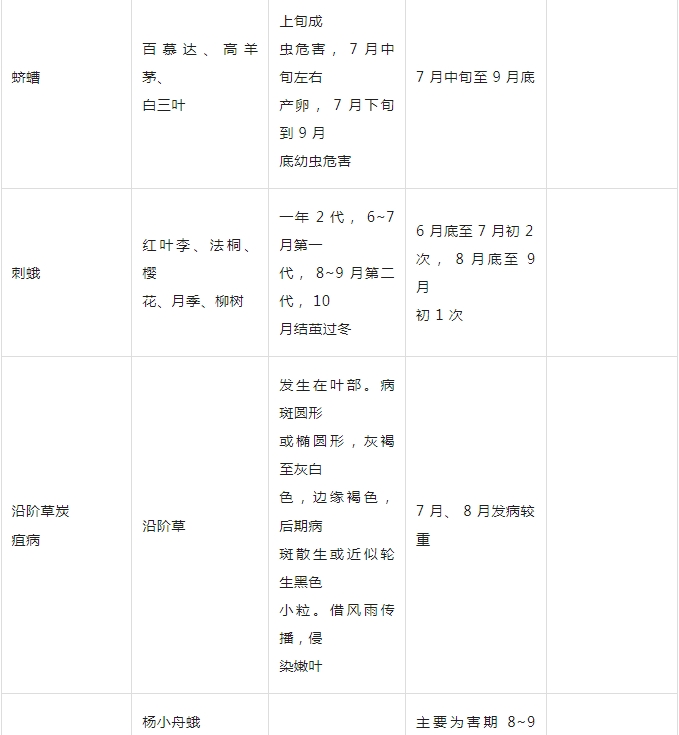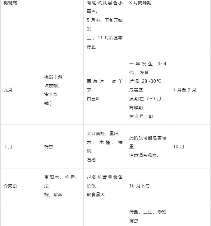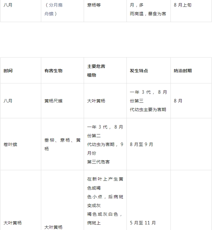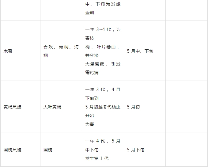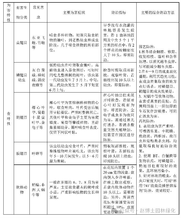 食叶害虫特点:a)食叶类害虫,如蝶、蛾幼虫,叶甲等,是园林植物的普遍性害虫。它们取食植物组织, 造成植物缺刻,直接影响园林景观效果。有些种类的发生具有周期性、暴发性和顽固性。b)通过特殊灯光(黑光)诱杀成虫、性信息素诱杀雄成虫,从根本上减少幼虫的发生数量。c)大多数食叶害虫的防治适期掌握在卵孵化盛期或 3 龄之前,如果发生不整齐,通常需要 连续用药 2-3 次。一般选用高效低毒、低残留的触杀和胃毒性杀虫剂,并应特别注意安全 间隔区。