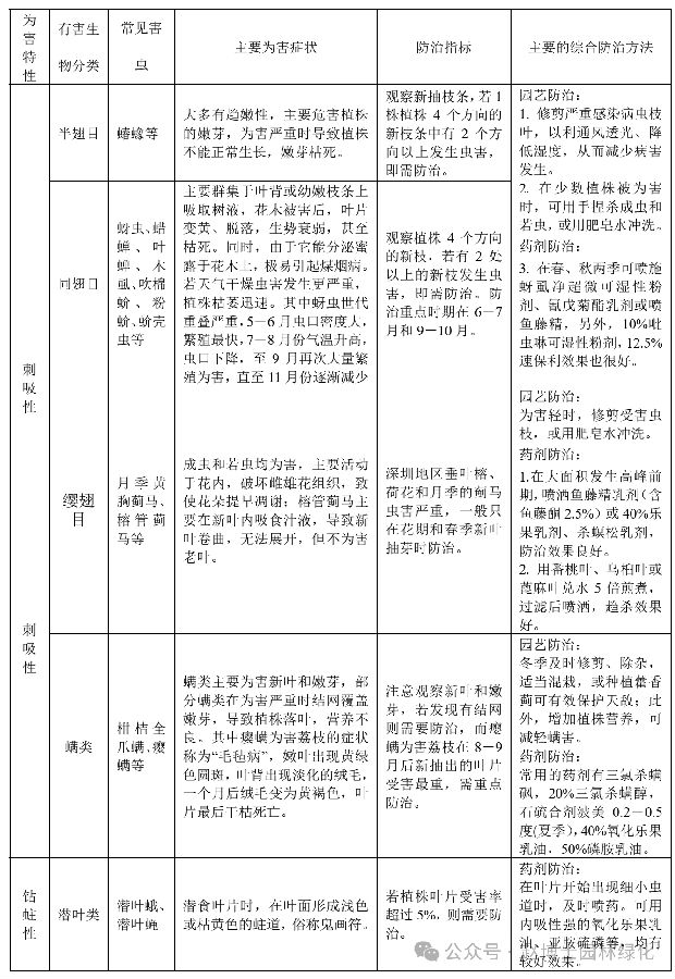 刺吸害虫是园林植物虫害中较大的一个类群。主要包括蚧类、蚜虫类、蝉类、虱类、螨类。成虫和若虫均以刺吸式口器危害绿化植物。叶片受害后失绿、卷曲枯萎、落叶、也是真菌病、细菌病、病毒病的主要传播媒介。应加强监测预报、综合治理、统防统治;采取以人工防治、释放天敌防治、安装诱虫灯防治、植物源药剂防治、生物药剂防治的综合防控措施,从而有效地控制害虫危害。