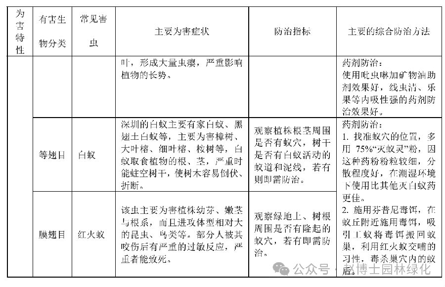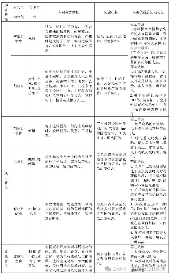地下害虫特点:地下害虫,如金龟子、叩甲、地老虎等,是园林植物特别是苗木和草坪的重要害虫,幼虫在地下咬食根部,造成地上部分衰弱或死亡,甚至大片草坪被毁。地下害虫的防治主要有诱杀成虫、土壤处理、毒饵诱杀、药液灌根、药枝诱杀、喷雾法等。a)土壤处理将农药均匀喷洒或喷雾于地面,然后犁入土中;将农药与粪肥、肥料混合施入;施用颗粒剂,与种子混合施入;条施、沟施或穴施。为减少污染和避免杀伤天敌,提倡局部施药和施用颗粒剂。b)毒饵诱杀利用毒饵诱杀是防治蝼蛄、蟋蟀、白蚁和红火蚁的理想方法之一。当发现蝼蛄等地下害虫为害后,可在傍晚每隔 3-4m 挖 1 碗大的浅坑,放 1 毒饵再覆土,每隔 2m 挖 1 排。c)药液灌根对出苗或定苗后幼虫发生量大的地块或苗床,可采用药液灌根的方法防治幼虫。d)药枝诱杀金龟甲在大黑鳃金龟、铜绿丽金龟等成虫出土盛期,用长 20-30 cm 的树枝浸于 40%氧化乐果 EC 30 倍液中,浸泡 10-15 h,于傍晚前取出插入地面诱杀。e)喷雾法在金龟甲成虫发生期间,喷洒农药于寄主植物上。防治根蛆可在成虫发生期喷洒农药在植株根部周围。