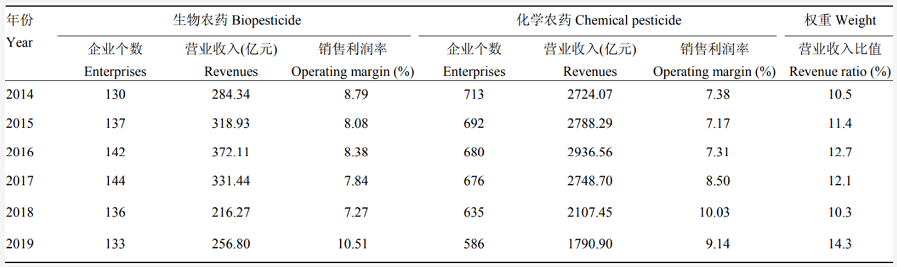 根据国家统计局数据,近年来我国生物农药行业,规模以上企业(年产值2,000万元以上)的变化情况如表1所示。2014—2016年,我国生物农药行业规模逐渐扩大,规模以上企业数量稳步增长,对应的营业收入持续增加。2017年我国实施新的农药行业管理法规政策、市场供需结构转变、行业资源整合优化、环保安监升级,国内市场表现出较大的变化,导致我国生物农药行业在2017年和2018年呈现下降趋势。2019年逐渐恢复,尤其是规模以上企业利润总额已经恢复至2017年水平,与此同时,生物农药行业的销售利润率达到近年最高点。从表1数据可以看到,规模以上企业(年产值2,000万元以上)的生物农药与化学农药的市场占比约为1/7。我国主要的农药市场仍然是化学农药市场,但生物农药的利润增长率有超过化学农药的趋势。我国某些明星生物农药如Bt年产值约3.5亿元,年出口1.5亿元左右,阿维菌素年产值15亿元,年出口约7亿元,两者的年产值及推广应用范围可与化学农药媲美,甚至远销国外。木霉菌等真菌生物农药发酵产抗逆性孢子工艺取得突破,广泛应用于防治蔬菜根腐病、灰霉病等土传病害。棉铃虫核型多角体病毒和黏虫颗粒体病毒等10多种昆虫病毒制剂获得登记。害虫天敌的生产与利用技术达国际领先水平,如赤眼蜂的年繁蜂量100亿头左右,应用面积133.3万hm2以上,是全球应用面积最大的国家。植物源农药快速发展,至今登记在册的植物源农药有效成分约30个,其中苦参碱、印楝素、鱼藤酮、芸苔素内酯和除虫菊素等植物源生物农药在我国农业生产实践中已得到了广泛的应用,植物源生物农药的推广有了长足的进步。