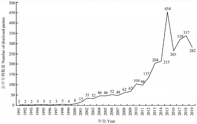 我们统计了1991—2019年间我国生物农药授权的专利数量,从图1可以看出,我国生物农药授权专利数量呈现逐年增长的趋势。按专利数量的增长规律,我们将专利申请增长过程简要划分为如下4个阶段:(1)2000年以前,授权专利数量增长缓慢,年授权专利数量小于8件;(2)2000—2010年,专利数量开始快速增长,授权专利数量由最初的8件左右逐年增加至100件左右,基本呈逐年增加的态势;(3)2010—2015年为直线上升期,授权专利数量达到最大值454件;(4)2015年之后,专利数量有所回落并呈现波动增长的态势,但年授权数量仍保持在250件以上。上述发展趋势与我国专利申请量发展的总体趋势有很多类似之处。据董林水等统计:2012年中国专利申请总量为5,633件,其中来自国内的申请占总量的86.22%,来自国外的申请只占总量的13.78%;在生物农药领域的中国专利申请中,国外申请主体以公司为主,占总量的81.67%,国内以院校、科研单位和个人申请类型为主,公司申请只占总量的18.87%。这与国内还没有形成以市场为导向的专利申请和保护体制有一定关系。刘煦东等统计了1996—2015年国际上生物农药的公开专利情况,共检出全球生物农药专利申请72,325件,授权专利27,336件,其中有效专利18,208件,授权专利中美国、德国、中国分别占22.9%、11.3%、10.3%,中国位列全球第三。可见中国在生物农药领域与发达国家特别是美国仍有很大差距,但这种差距在逐步减少。