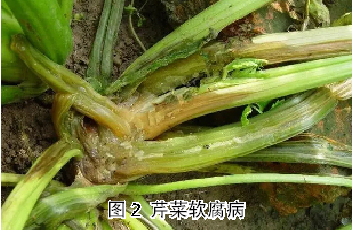 4. 芹菜软腐病又称“烂疙瘩”,属于细菌性病害。该病多发生在芹菜移栽缓苗期或缓苗后的生长初期。一般先从柔嫩多汁的叶柄基部开始发病。发病初期,病斑淡褐色水渍状,呈纺锤形或不规则形,稍凹陷,迅速扩展后内部组织呈黑褐色腐烂,有恶臭,最后仅残留表皮(见图2)。