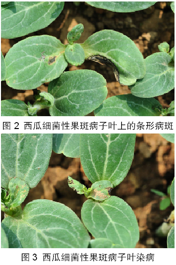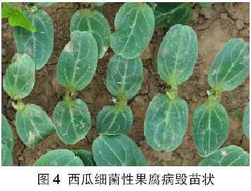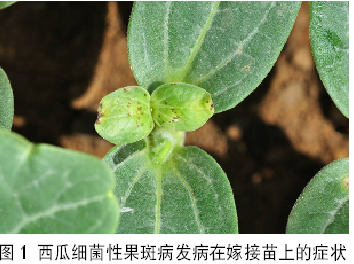 先在西瓜等瓜类蔬菜幼苗的子叶背面出现水渍状黄色小斑点,并伴有黄色晕圈,扩大成坏死斑,叶片背面呈水渍状。子叶张开后,水渍状斑点(图1)逐步沿叶脉发展,并变为条形或不规则形暗绿以水渍状病斑(图2、图3),随着幼苗的生长,病斑变成黑褐色并卷缩萎蔫。随后感染真叶,真叶受害初期出现水渍状小斑点,病斑扩大时受叶脉限制呈多角形、条形或不规则形暗绿色病斑,在水渍状病斑背面常有菌脓溢出,干后变一薄膜,发白发亮。病斑可融合成大斑,颜色变深呈褐色至黑褐色。嫁接初期感病,接穗的子叶背面出现水渍状,并很快蔓延到下胚轴及嫁接口,导致接穗腐烂死亡(图4)。种子带菌的瓜苗在发病后1~3周即死亡,严重时子叶病斑可扩展到嫩茎,使得整株幼苗坏死。