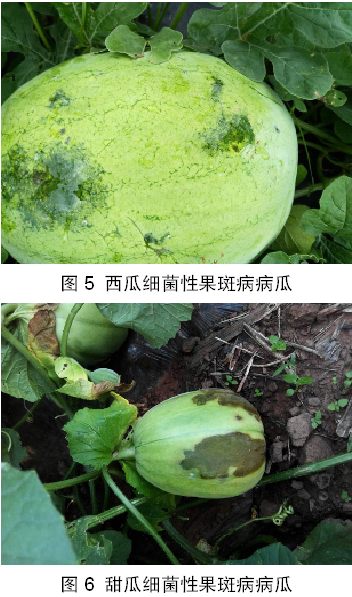 初在果实上部表面出现数个几毫米大小的灰绿色至暗绿色水渍状斑点,后迅速扩大成大型不规则的水渍状斑(图5、图6),发病部位逐渐变褐或龟裂,致果实腐烂,并分泌出黏质琥珀色物质,该病多发生在果实向阳面。病瓜周围病叶上现褐色小斑,病斑常在叶脉边缘,有时被一个黄色组织带包围,病斑周围呈水渍状是该病区别于其他细菌病害的重要特征。