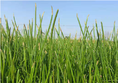 白粉病 白粉病是荸荠生长过程中的一个重要病害,主要发生在荸荠分蘖盛期,容易与秆枯病伴随而生,特别是在高温高湿的条件下容易发生,通常发生在荸荠的花、茎、叶部,最明显的发病特征是在发病部位出现一层白粉状霉层,导致荸荠叶片失绿干枯失去光合作用,最终整株死亡造成减产。