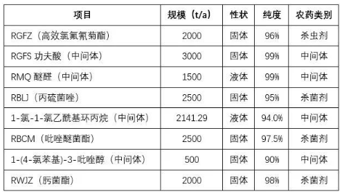 其中的中间体项目包括:功夫酸3000吨/年、中间体1-(4-氯苯基)-3-吡唑醇500吨/年、1-氯-1-氯乙酰基环丙烷2141.29吨/年、醚醛1500吨/年。