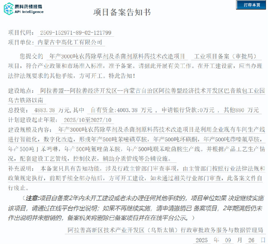 近日,关于内蒙古中高化工有限公司年产3,000吨农药除草剂及杀菌剂原料药技术改造项目在相关网站备案公示。