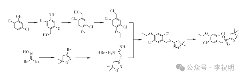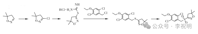 路线二:专利WO2011063842A报道了以5,5-二甲基-4,5-二氢异噁唑为原料经2步反应合成异噁唑盐酸盐,再与2,5-二氯-4-乙氧基苄氯发生亲核取代反应合成前体3-(2,5-二氯-1-乙氧基-4-基)甲硫基-4,5-二氢-5,5-二甲基异噁唑,然后在氧化生成苯磺噁唑草。合成路线如下: