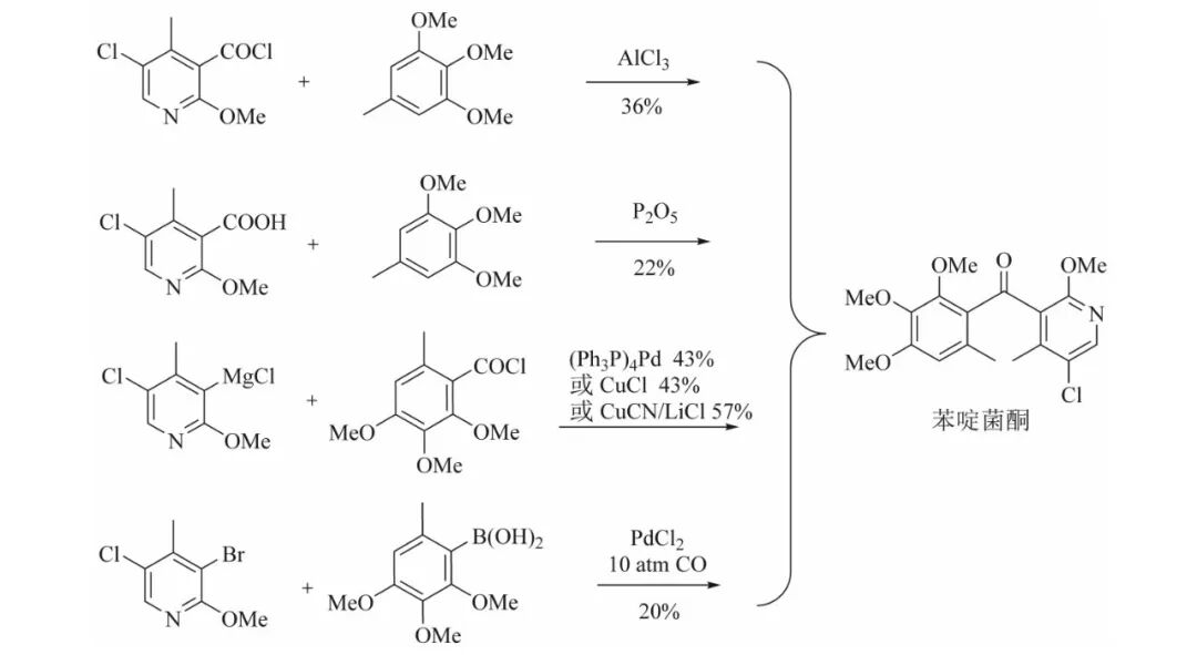 从a和b处切断直接构建羰基,可衍生出4种合成方法(见图2),这4种合成方法涉及吡啶酰氯的傅氏酰基化反应、吡啶羧酸在五氧化二磷存在下的直接酰化反应、苯甲酰氯与格氏试剂在催化剂下的酰化反应以及氯化钯催化下的苯基硼酸酰化反应。在前2个反应中,中间体5-氯-2-甲氧基-4-甲基烟酸的合成需采用昂贵的2-氯-4-甲基烟酸甲酯作为起始原料。且上述4种方法存在共同缺陷,即合成路线最后一步单元反应收率低且成本高。这些缺点使得上述工艺路线不适合作为工业化生产路线。