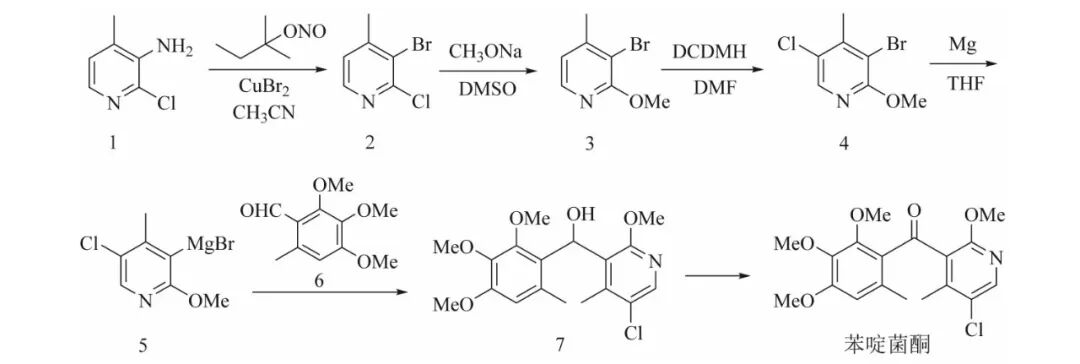 以3-氨基-2-氯-4-甲基吡啶为原料,经过重氮化、甲氧基取代、氯代、格氏反应、氧化5个步骤,合成苯啶菌酮,总收率为36.3%,纯度98.5%。此路线避免了难分离副产物的产生,产品纯度高。格氏反应采用″一步法″进行反应,可有效减少副反应的发生;氧化反应创新性的采用DMSO-乙酸酐-三乙胺协同氧化体系代替二氧化锰氧化法,有效克服了后者因搅拌局限导致传质不足、反应时间延长甚至停滞的难题,为规模化生产提供了更高效的氧化路径。