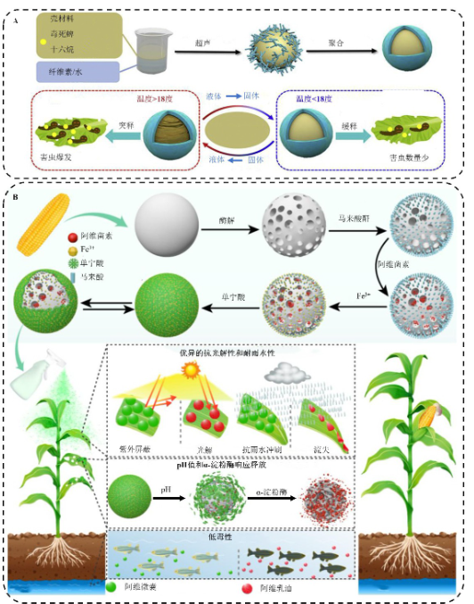 温度响应体系利用相变材料或温敏聚合物作为调控核心,在不同温度条件下实现药剂的差异化释放。Li等开发的温敏型吡唑醚菌酯微囊在高温下表现出快速释放特性,对稻瘟病的药效与原药相当,但对水生生物的急性毒性显著降低,体现了温控释放在稻作病害管理中的应用价值。同样,基于正十六烷核和纳米纤维素壁材构建的毒死蜱温敏微囊在作物叶片上表现出优异的黏附性和耐雨水冲刷,且释放速率随温度升高显著加快,使对小菜蛾等害虫的药效增强,同时将对斑马鱼的急性毒性降低了5倍以上(图10A)。这些成果表明,通过温度响应与释放调控相结合,可以显著提高农药利用率并增强对环境变化的适应性。
