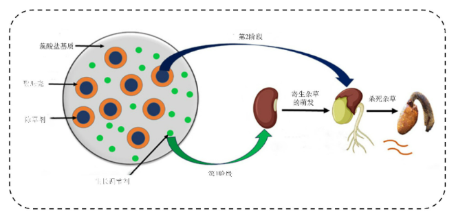 在合成壁材体系中,聚脲和聚氨酯最具代表性,通常通过界面聚合法制备,能在油–水界面快速形成致密壳层,从而获得包封率高、形貌规则和粒径分布均一的微囊。大量研究证明,采用界面聚合法制备的农药缓控释微囊不仅能延长活性成分的释放周期,还能显著提升田间防治效果。如以改性异氰酸酯制备的聚脲微囊对高效氯氟氰菊酯实现了超过90%的包封率,并在体外释放中表现出稳定的缓释性能,延长了对害虫的持效期。类似地,丙草胺聚脲微囊悬浮剂在优化工艺条件下不仅具有优异的控释性能,还在提升对稗草的除草活性的同时降低了对水稻的药害,体现了合成壁材在提高农药选择性和安全性方面的潜力。载吡唑醚菌酯的聚脲微囊在保持高效防治稻瘟病的同时大幅降低了对水生生物的毒性;采用反应性乳化剂制备的聚氨酯微囊赋予咪鲜胺更优异的叶面黏附性和光稳定性,从而延长了药效。而氟乐灵和二甲戊灵等易光解和易挥发除草剂,在聚氨酯或聚脲微囊化后明显提升了环境稳定性与除草效率。类似地,阿维菌素B2微囊也通过聚氨酯壁材实现了抗光解效应,并表现出优良的缓释与防治线虫效果。在进一步的研究中,Maruyama等比较了不同合成壁材(聚脲与三聚氰胺-甲醛)的释放特性,发现其对有效成分的释放行为和田间持效期具有显著差异;同时,双剂微囊体系利用尿醛树脂实现了植物源与微生物源活性成分的协同增效,为线虫防控提供了可持续的新思路。双层包覆系统可实现多活性成分的分级释放,Aher等的研究将聚脲内壳负载莠去津、海藻酸盐外层包载赤霉酸,在实验中表现为赤霉酸快速释放(约3 h),诱导寄生杂草种子自杀性萌发,而莠去津则缓慢释放(约96 h),在幼苗阶段实现杀灭。实现了″先诱导、后杀灭″的寄生杂草控制策略(图4)。