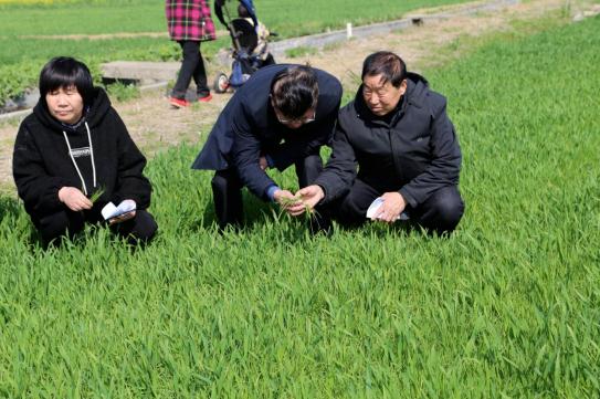 随后,科技下乡服务团队来到刘桥镇蒋一农地粮食种植合作社承包的麦田,只见麦苗长势比泽明家庭农场更高更壮些,已开始进入拔节状态,但部分叶片有微微泛黄色。蒋一农地粮食种植合作社年轻的负责人也是村干部的黄宏指着麦苗对我们说,这是前几日刚化除过后的过敏症状,属于正常现象,根据以往经验再过一周左右将会恢复青枝绿叶状态。