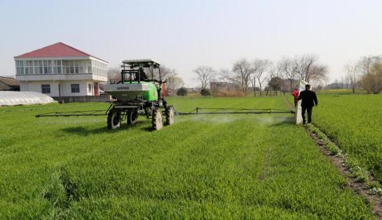 喷药设备是当下农场较为先进的智能自走式喷雾机,喷药时打开喷杆就像行走在麦田里酷炫的喷药“巨人”,它不但可调节喷药高度、可折叠喷杆还能像机翼一样能收放自如,而且工作效率高、施药均匀、不漏喷、不重喷。防治效率特别高,一天能喷药150亩,是普通背负机动弥雾机效率的5倍以上。
