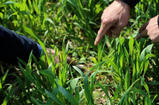 “由于前期雨水多、温度低,麦田渍害比较厉害,严重影响了根系发育,小麦长势差、叶色发黄,尤其是白根数量减少,根系短且发黄,影响根系对养分、水分的吸收,农场通过喷施了磷酸二氢钾和芸薹素内酯,这才改善了根系,小麦长势明显好转。”吴泽华比划着告诉我们。