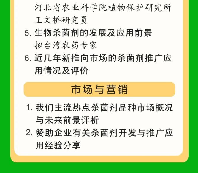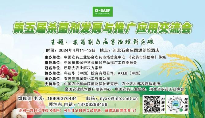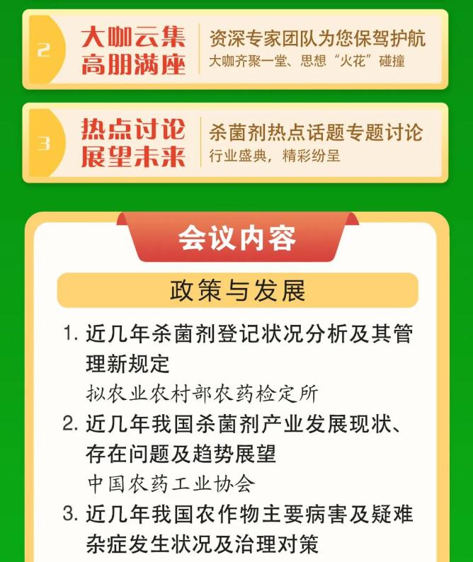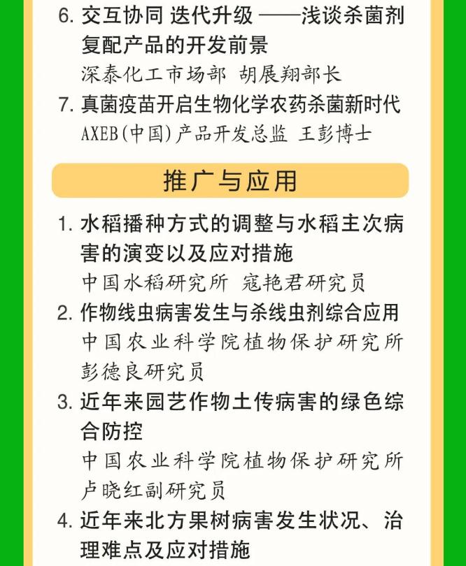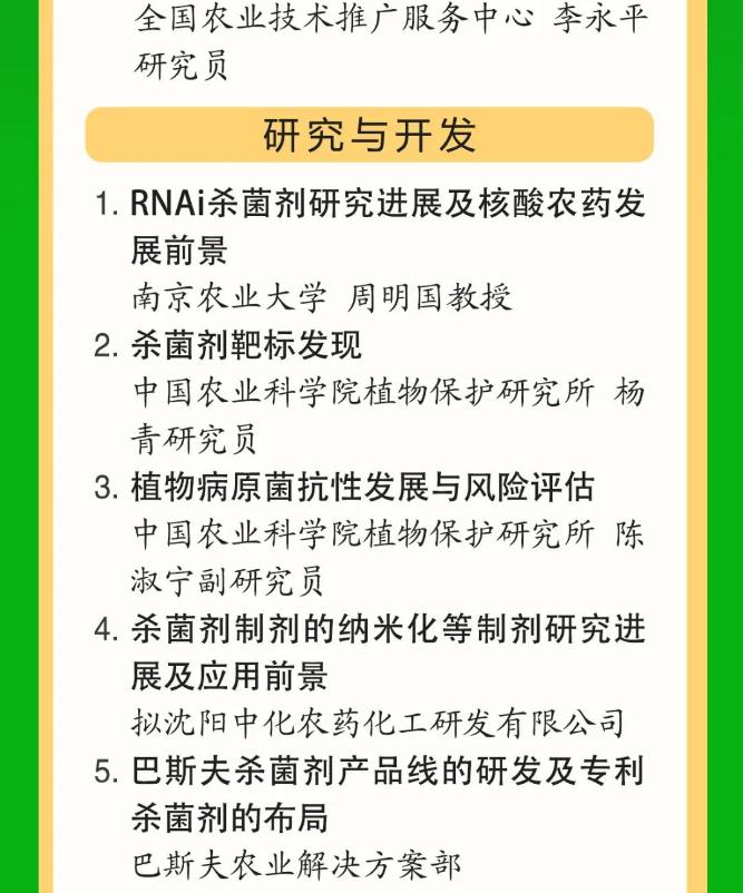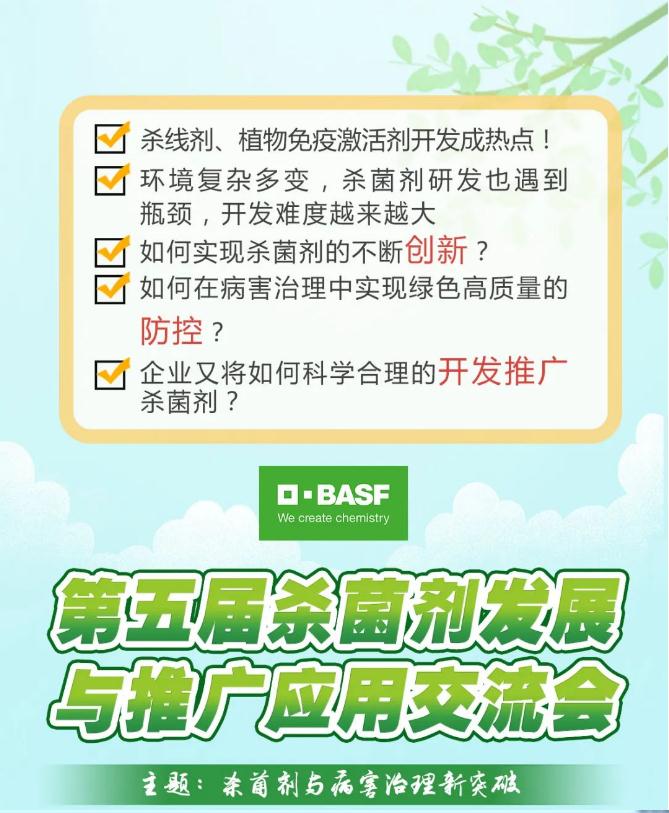 有关农药行业更多科技创新、市场行情等内容,敬请关注第五届杀菌剂发展与推广应用交流会,包括行业杀菌剂知名专家及巴斯夫、科迪华、AXEB、深泰等将会给与会代表分享杀菌剂与病害治理解决方案和新突破。