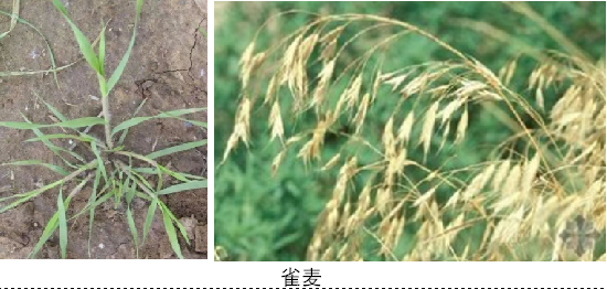 雀麦,别称野麦子,与小麦同属禾本科,雀麦出苗前期于小麦相似,不易识别,很容易错过防治最佳时期;且雀麦成熟期比小麦早,种子繁殖率很高,防治失败后会导致雀麦数量越来越多。有的麦地整块长满雀麦,严重影响小麦产量。在小麦越冬前使用甲基二磺隆、氟唑磺隆都能有效防治雀麦,可降低雀麦对小麦的竞争抑制作用,显著提高小麦产量。可使用70%氟唑磺隆WDG,亩用量3~4g,对水30L,均匀喷雾。