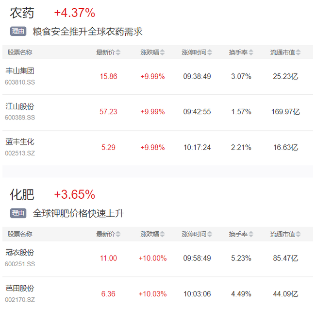 4月19日,农业产业链表现活跃,农药股丰山集团、江山股份、蓝丰生化、利民股份涨停,化肥板块冠农股份、天禾股份、芭田股份涨停,富邦股份、宏达股份等涨幅居前……