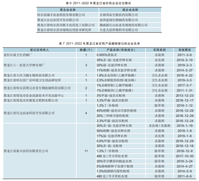 (5)迁出企业 从企业转移向外搬迁来看,2011-2022年4家农药企业迁出黑龙江省,搬迁至吉林、河北、湖南、辽宁各1家(见表6)。此外,从撤销企业登记来看,与2011年前登记的企业相比,9家企业25个产品撤销登记(见表7)。从表7可以看出,撤销登记产品大多为高危农药(已经知道或可以预期),如含克百威、乙酰甲胺磷、溴鼠灵、多菌灵、草甘膦等成分的农药。还可以看出敌磺钠、烯唑醇、三环唑、灭草松等单剂,以及多·福·克、福·克、甲霜·福美双、唑酮·福美双、丁·扑等复配产品的品种不被市场关注、农民认可,正悄悄退出农药市场。