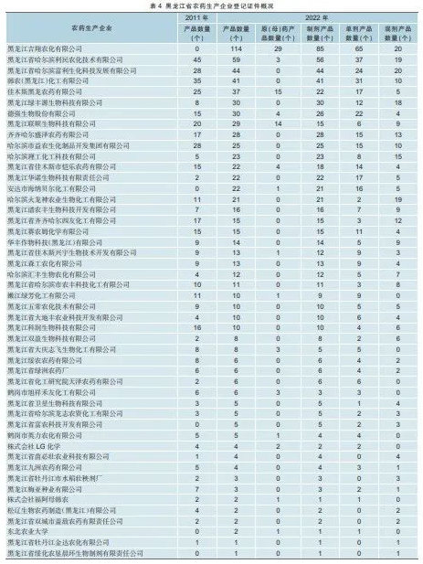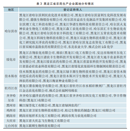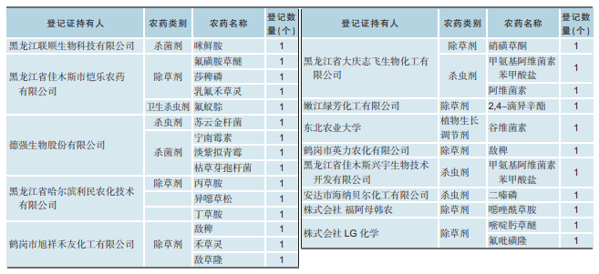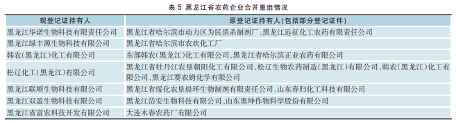 备注:当前松辽化工(黑龙江)有限公司,曾用名黑龙江赛农姆化学有限公司,其先后变更或并购了韩农(黑龙江)化工有限公司、松辽生物农药制造(黑龙江)有限公司的部分登记证件;韩农(黑龙江)化工有限公司,曾用名东部韩农(黑龙江)化工有限公司,之前并购了黑龙江省哈尔滨正业农药有限公司的登记证件;黑龙江双盈生物科技有限公司先后并购了黑龙江岱安生物科技有限公司、山东奥坤作物科学股份有限公司(部分登记证件),等等。