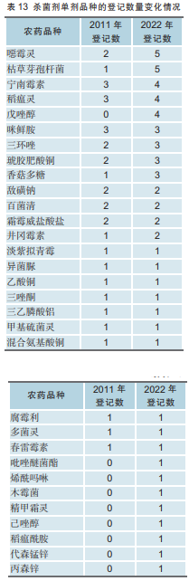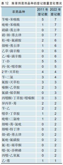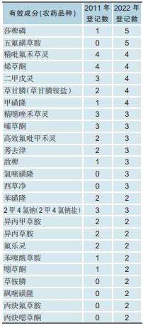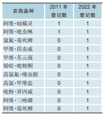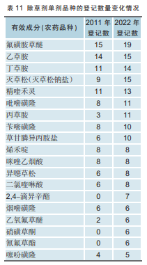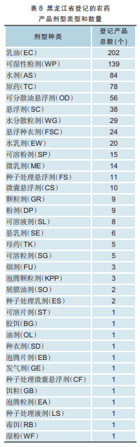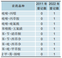 (5)农药新品种 与2011年前登记农药品种相比,表10-22可以看出,共登记农药新品种134种(除草剂82种,单剂17种、混剂65种;杀菌剂23种,单剂9种、混剂14种;杀虫剂16种,单剂6种、混剂10种;其他农药7种,单剂0种、混剂7种;植物生长调节剂5种,单剂2种、混剂3种;卫生杀虫剂1种,单剂1种、混剂0种;杀鼠剂0种),其中东北农业大学创制的植物生长调节剂谷维菌素,黑龙江省哈尔滨富利生化科技发展有限公司研发的吡嘧·硝草酮,黑龙江华诺生物科技有限责任公司研制的吡嘧·吡氟酰,哈尔滨火龙神农业生物化工有限公司开发的呋虫胺·嘧菌酯·种菌唑、吡唑酯·咯菌腈·精甲霜,华丰作物科技(黑龙江)有限公司研发的丙炔氟·乙草胺,哈尔滨汇丰生物农化有限公司登记的滴异酯·噻吩隆·乙草胺,黑龙江科润生物科技有限公司研制的滴辛酯·噻吩隆·乙草胺,黑龙江省佳木斯兴宇生物技术开发有限公司研发的多·福·甲维盐等产品,独一无二,处于领跑地位;黑龙江省哈尔滨富利生化科技发展有限公司研制的苯·苄·西草净,韩农(黑龙江)化工有限公司生产的丙草·西草净,齐齐哈尔盛泽农药有限公司开发的苯·苄·硝草酮,黑龙江绿丰源生物科技有限公司制成的苄·扑·西草净、丙草胺·西草净·乙氧氟、丙噁·五氟磺等等,处于领先地位;黑龙江联顺生物科技有限公司生产的吡嘧·二甲戊产品处于并跑阶段,上述产品表明我省已成为我国具有自主创制农药能力的省份之一。