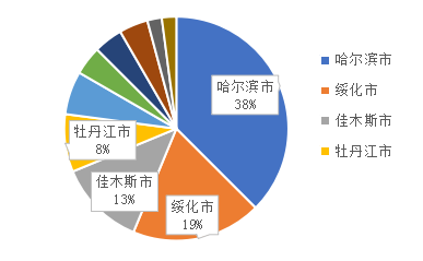 (1)企业分布 从农药生产企业分布来看,48家生产企业分布在我省10个地(市)。其中,农药企业在6家以上的地(市)有3个,按农药生产企业家数从高到低排列依次为哈尔滨市(18家)、绥化市(9家)、佳木斯市(6家)见图2;2家以上的地(市)有5个,依次为牡丹江市(4家)、齐齐哈尔市(3家)、黑河市(2家)、鸡西市(2家)、鹤岗市(2家);其余为七台河市、大庆市各有1家。黑龙江省农药生产企业分布情况见表3。