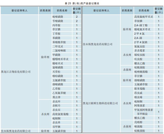 据统计,黑龙江省登记的784个农药产品中,共有83个原药(含5个母药)登记证件,701个制剂产品登记。登记的68种83个原(母)药产品中,除草剂登记48个,杀虫剂24个,杀菌剂9个,植物生长调节剂1个,卫生杀虫剂1个;98%含量16个,97%含量8个,96%含量12个,95%含量27个,94%含量3个,93%含量1个,92%含量4个,91%含量1个,90%含量2个,88%含量1个,80%含量1个,79.1%含量2个,40%含量2个,100亿孢子/克、1万亿芽孢/克和50000IU/毫克各1个;低毒61个,中等毒12个,微毒8个,高毒2个;除登记的制剂产品有效成分外,原药产品有效成分5种,分别是禾草灵、噁唑酰草胺、2,4-滴、啶酰菌胺、螺虫乙酯;原药生产企业15家,其中境外企业2家。15家原药生产企业集中在7个地(市)内,依次为哈尔滨市4家,佳木斯市3家,绥化市、鹤岗市各2家,牡丹江市、大庆市、黑河市、七台河市各1家。原(母)药产品登记情况见表25。6.原(母)药登记