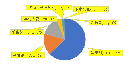 (2)农药类别 从农药类别来看,黑龙江省农药登记制剂产品有七类:除草剂产品443个,占农药登记总数63.2%;杀菌剂122个,占比17.4%;杀虫剂90个,占比12.84%;其他农药28个,占比为3.99%;植物生长调节剂、卫生杀虫剂、杀鼠剂共占2.57%。