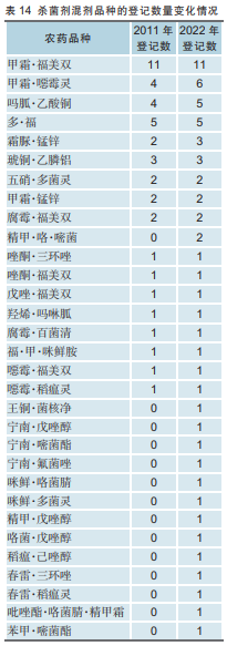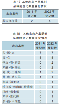 登记的28个其他农药产品(含杀菌剂/杀虫剂、杀虫剂/杀菌剂、杀虫/杀菌剂、杀菌剂、杀虫剂,其中有的多·福·克登记在杀虫剂、杀菌剂、杀虫剂/杀菌剂、杀虫/杀菌剂上,实际为杀虫杀菌剂;福·克登记在杀菌剂、杀虫剂/杀菌剂上,实际为杀虫杀菌剂;苯甲·毒死蜱、井·噻·杀虫单、克·戊·三唑酮登记在杀菌剂上,实际为杀虫杀菌剂;苏云金杆菌登记在杀虫剂/杀菌剂上,实际为杀虫杀线虫剂)中,有单剂4个,混剂11种24个。有效成分3种,其中单剂1种、混剂2种,而混剂中只有噻虫嗪和种菌唑有效成分未以单剂形式在其他农药产品上登记。其他农药产品单剂、混剂品种的登记数量变化情况,分别见表17、表18。