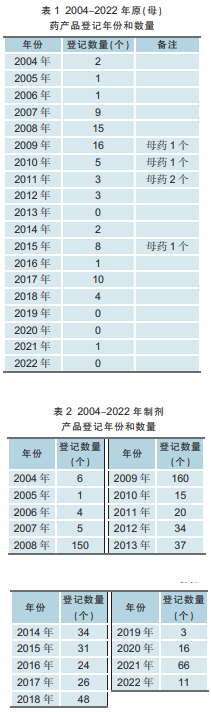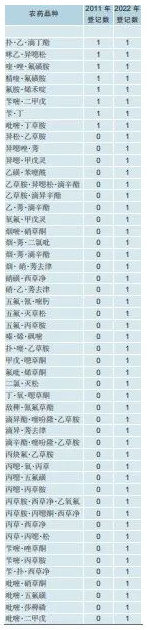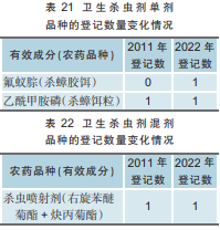 登记的3个卫生杀虫剂产品中,有单剂2个,混剂1种1个。有效成分4种,其中单剂2种、混剂2种,而混配制剂中只有炔丙菊酯、右旋苯醚菊酯2种有效成分未以单制剂形式在卫生杀虫剂上登记。卫生杀虫剂单剂、混剂品种的登记数量变化情况,分别见表21、表22。