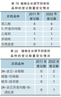 登记的14个植物生长制剂产品中,有单剂9个,混剂4种5个。有效成分10种,其中单剂5种、混剂5种,而混剂中只有24-表芸苔素内酯、赤霉酸A3、烯腺嘌呤、噻苯隆、S-诱抗素等5种有效成分未以单制剂形式在植物生长调节剂上登记。登记的植物生长调节剂单剂集中在前2种有效成分(见表19),占植物生长调节剂单剂登记总数的66.67%。混剂产品中,含24-表芸苔素内酯的产品居第一位,有3个。植物生长调节剂单剂、混剂品种的登记数量变化情况,分别见表19、表20。