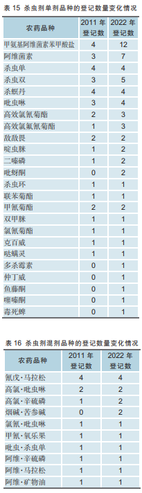 登记的90个杀虫剂制剂产品(含杀螨剂/杀虫剂、杀虫剂/杀螨剂、杀虫剂/杀菌剂、杀螨剂、杀菌剂,其中有的阿维菌素登记在杀菌剂上,实际为杀虫剂;苏云金杆菌登记在杀虫剂/杀菌剂上,实际为杀虫剂)中,有单剂63个、混剂21种27个。有效成分36种,其中单剂24种、混剂12种,而混剂中只有氰戊菊酯、马拉硫磷、烟碱、苦参碱、辛硫磷、氧乐果、噻虫胺、异丙威、三唑磷、矿物油、烯啶虫胺、茚虫威等有效成分未以单制剂形式在杀虫剂上登记。单剂集中在前8种有效成分(见表15),占杀虫剂单剂登记总数的66.67%。混剂产品中,含阿维菌素成分的产品居第一位,有7个。杀虫剂单剂、混剂品种的登记数量变化情况,分别见表15、表16。