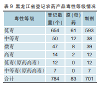 黑龙江省登记农药产品毒性等级统计见表9,其中:低毒农药品种654个,占农药登记总数的83.4%;中等毒农药品种50个,占比6.3%;微毒农药品种47个,约占6%;其后高毒14个、低毒(原药高毒)12个、中等毒(原药高毒)7个。