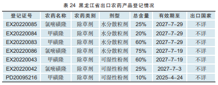 (6)出口农药 从出口农药(包括仅限出口农药、专供出口农药)登记来看,我国共批准我省1家企业(黑龙江吉翔农化有限公司)出口农药业务,其出口产品均为除草剂,有效成分有2个,分别是氯嘧磺隆、甲磺隆,产品登记数量共7个(见表24),其中甲磺隆为禁止在国内销售和使用的除草剂品种。