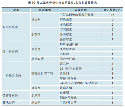 从农药种类来看,黑龙江省农药登记产品以化学农药为主,有720个,占比达91.84%;生物农药产品64个,占比为8.16%,说明黑龙江省绿色有机农作物病虫害防治有药可用。在生物农药中,从登记品类来看,农用抗生素占半壁江山,达34个(见表10),微生物农药、生物化学农药、植物源农药次之,分别有14个、12个、3个,其他农药仅1个;从登记农药的用途来看,有杀虫剂30个、杀菌剂20个、植物生长调节剂9个、其他农药5个。从登记的有效成分来看,生物化学农药的有效成分最多,有8种,农用抗生素、微生物农药、植物源农药的有效成分次之,各有6种、4种、3种。