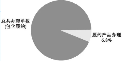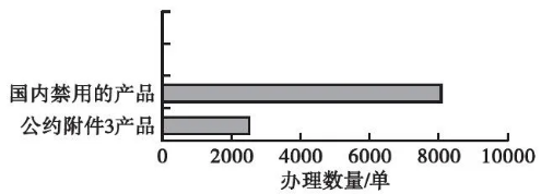 2020年共审核履约材料10,552单,占放行单总量的6.8%左右(见图5),其中涉及附件3产品的2,000多单,国内禁用产品8,000多单(见图6)。