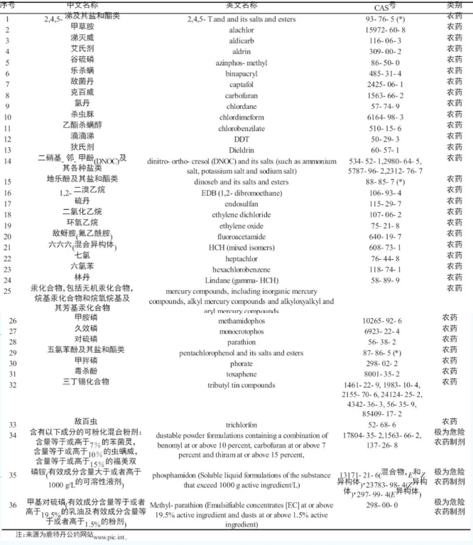 公约清单是开放性的,目前有53种(类)化学品,其中农药类33种,极为危险的农药制剂3种,工业化学品17种(见表1)。