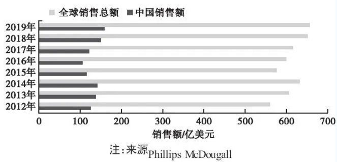农药是精细化工行业,能够生产农药原药的国家不多,很多国家主要依靠进出口贸易来获取农药原药。我国农药工业产业链齐全,品种丰富,质优价廉,深受全球农药加工企业和农业生产者的喜爱,在全球占据重要的市场份额,中国农药在全球农化生产,保障全球粮食安全中发挥着重要作用。如图1所示,2012—2019年中国农药的销售总额在全球销售总额中占很大部分。