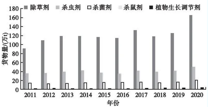 我国农药行业虽然起步较晚,但已成为全球第一大农药生产国,对外出口比例占60%~70%(见图2)。我国农药出口的种类主要是除草剂、杀虫剂、杀菌剂,一些杀鼠剂,植物生长调节剂也有一些少量的出口(见图3)。