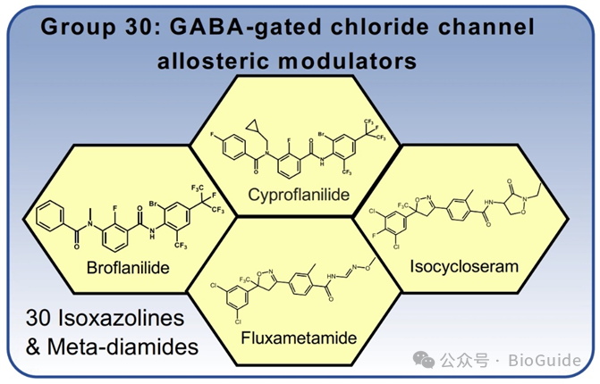 Group 30中其他三个化合物分别为:溴虫氟苯双酰胺(Broflanilide)及环丙氟虫胺(cyproflanilide)属间二酰胺类;异噁唑虫酰胺(Isocycloseram)属异噁唑类。