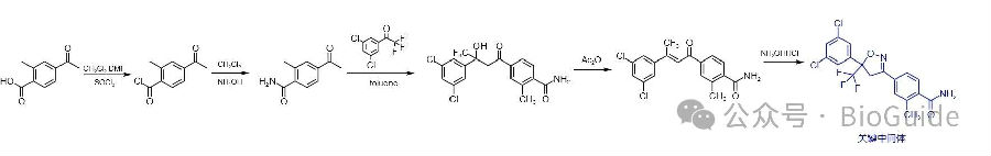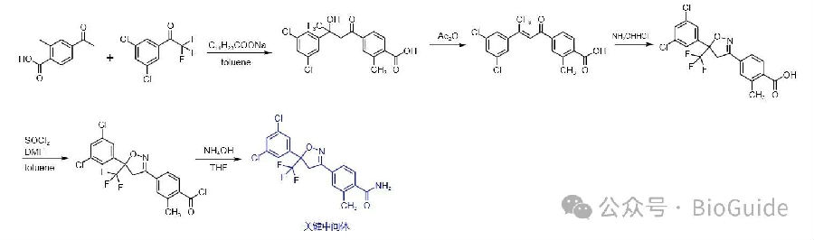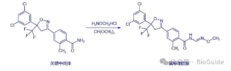 氟唑酰胺的合成主要由关键中间体4-[5-(3,5-二氯苯基)-5-三氟甲基-4,5-二氢异唑-3-基]-2-甲基苯甲酰胺与甲氧胺盐酸盐和原甲酸三乙酯反应得到: