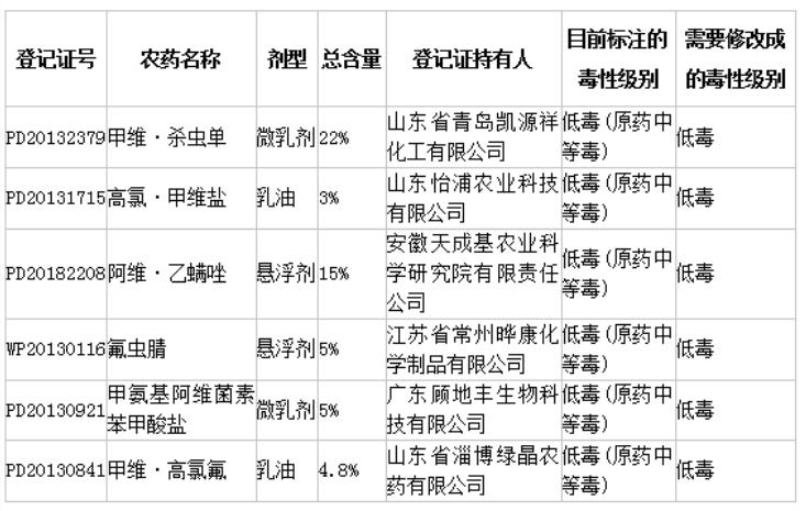 近期在中国农药信息网查询时发现,以下6个处于登记有效期的农药产品的毒性级别均标注为“低毒(原药中等毒)”,与上述规定不符,应将“(原药中等毒)”字样删除,直接标注为“低毒”即可: